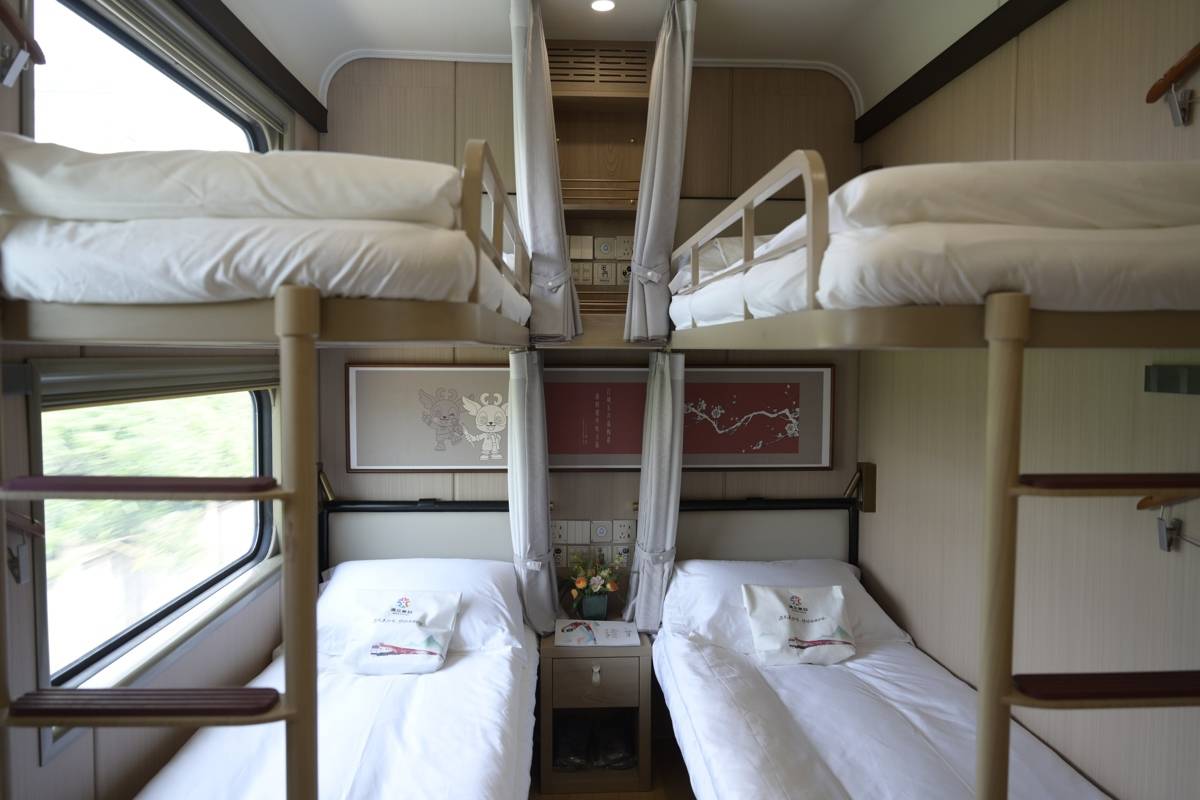 极目新闻记者登车看到,这趟全新的旅游专列是对传统老式绿皮车爆改而来,里里外外都再看不到普速列车的影子。与传统卧铺横在车厢内不同,这趟列车的所有床铺为纵向布局,也就是沿着车窗布设,更方便在床上观景,躺卧也更加舒适。