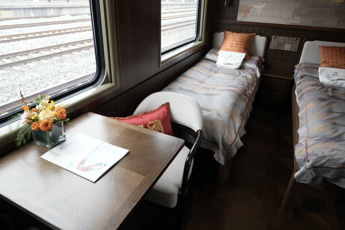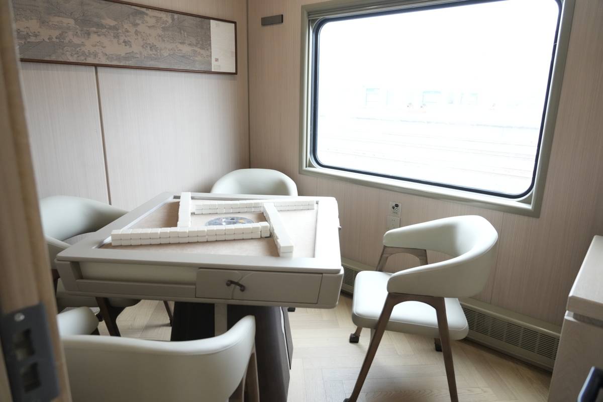 车厢内设有大床房、双人间、三人亲子房(2下铺1上铺)、四人间(2下铺2上铺),每个包间均有独立卫浴。此外,车上还设有棋牌室、K歌房、茶室等多功能房间,配备明厨现炒的餐车。