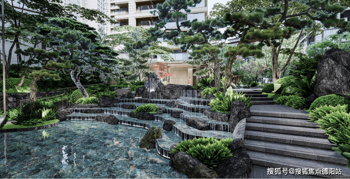 ④星级酒店式度假园林,享受高端生活松弛感度假酒店风格园林,用自然主义的手法将建筑隐于绿林中,以“水系+森系”两大灵感元素构建流水森境,让居者成为自然的座上宾