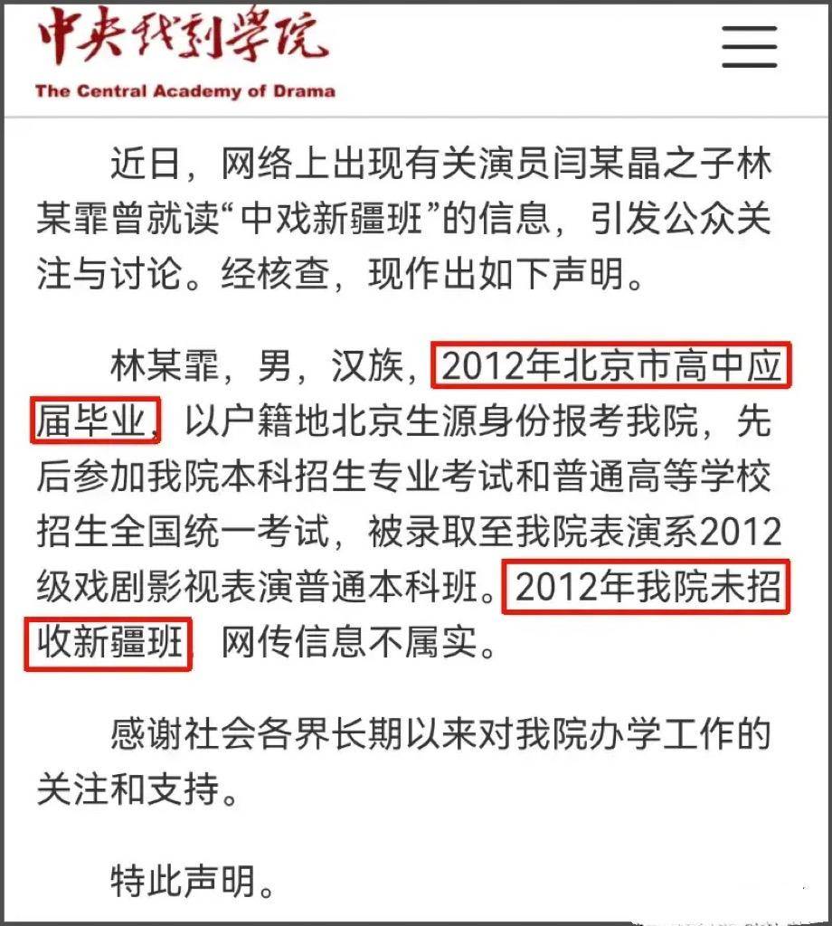 更有意思的是,针对其儿子林傲霏的高考资格,中央戏剧学院的声明虽然澄清了“2012年未招新疆班”,却巧妙地回避了2011年预科班的敏感细节。