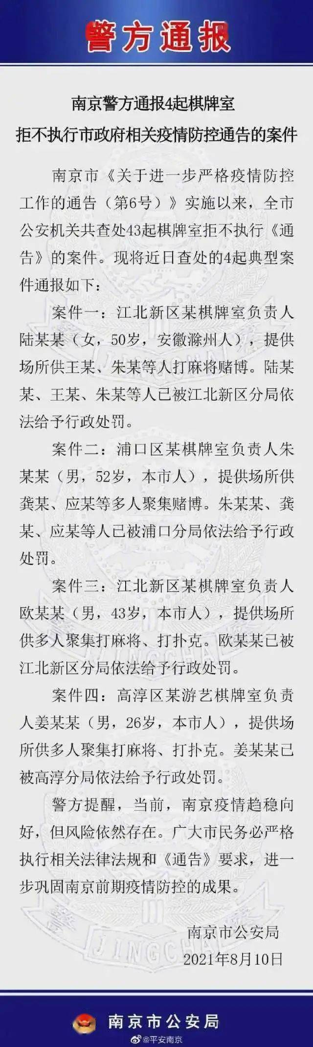 棋牌平台,棋牌官网网站,棋牌游戏APP下载8月10日,据@平安南京 微博消息,南京警方通报4起棋牌室拒不执行市政府相关疫情防控通告的案件。详情:
